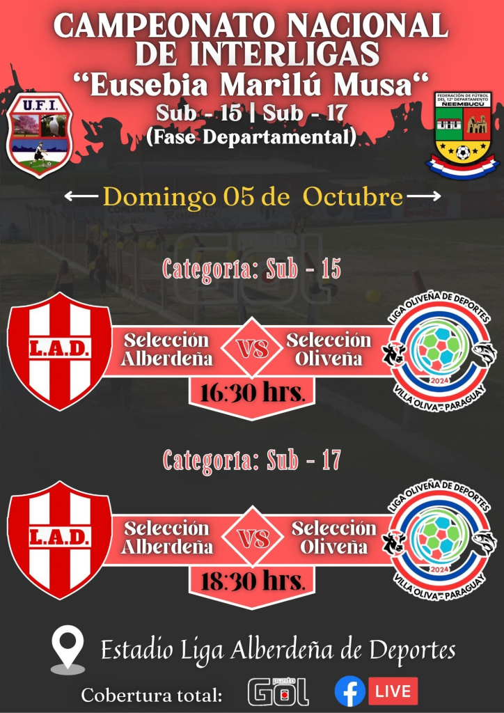 El domingo por primera vez en la historia se dará el partido entre éstas selecciones , la añeja liga alberdeña versus la jóven liga oliveña , cara a cara por la ida de las semifinales del pupular Campeonato Nacional de Interligas en su Fase Departamental , dicho certamen deportivo llevará el nombre de la Sra. Eusebia Marilú Musa , quién será homenajeada de tal manera.![]()